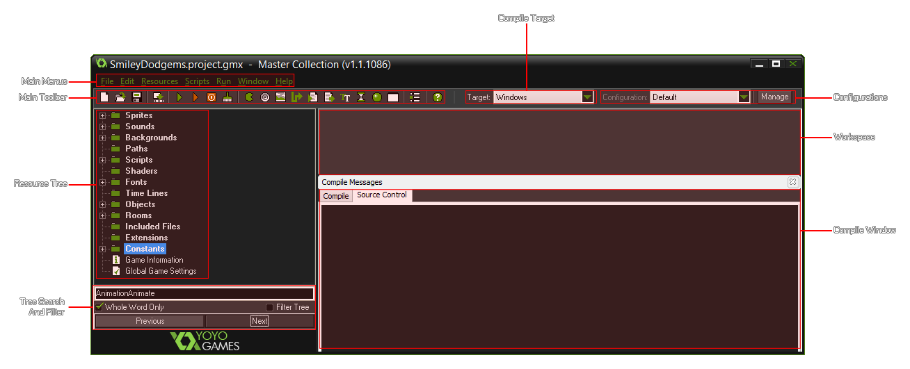 This is the area where you will be editing your resources, setting up rooms and working with your objects, code and all other resources.