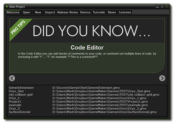 Beneath the tabs, there is a section with hints, tips and offers related to GameMaker: Studio, which you can scroll through using the arrow icons on either side, and beneath that you will see listed any projects