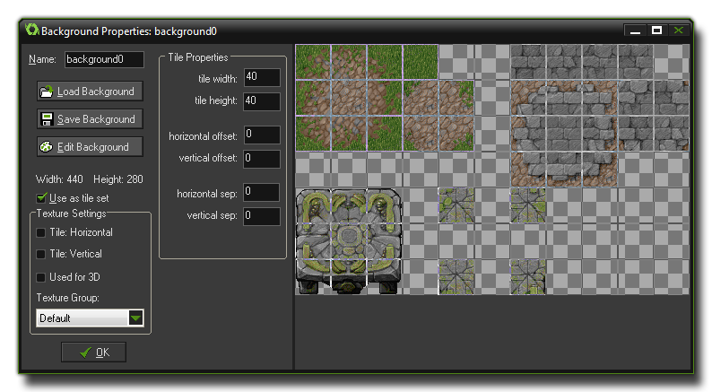 Sometimes you want to have a background image broken up into a set of tiles, which basically means, one large image composed of different sub images that can all be linked together. When creating rooms you can then add these subimages at different places to create beautiful levels with graphical effects that are "cheap" in that they use very little processing power to draw. Please note that tiles are purely graphical and do not have most of the properties you would find in an object or a sprite which is why they are fast. To use a background as a tile set, check the box labelled Use as tile set and the background window now changes to look as follows: Now you can indicate a number of settings for the tile set, like the width and height for each tile (only one size can be given, so better make sure that all tiles in the set have the same size. If you have different sizes, create two or more tile sets). You can also indicate an offset (in pixels) where the top left-most tile starts as well as a separation between the tiles (in pixels) between the tiles themselves. For more information on tiles see the section in the Advanced Use part of the manual More About Backgrounds, and for information on how to use tiles in the room editor you can go to the section More About Rooms.