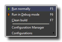 This menu has options that relate to testing your games and to setting up configurations (note that each of these items has a corresponding button on the GUI Toolbar):