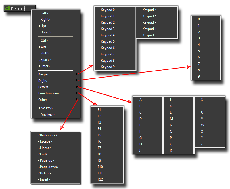 Now, most of them are fairly obvious, but let's just go through the sections briefly - at the top we have the arrow keys, followed by the most used modifier keys, then the rest of the keyboard (split into sub sections as you can see) and finally two very special sub events, No Key and Any Key. As their names imply, these are sub events that check for when no key is pressed or for when any key is pressed. Please note that the keys on the numeric keypad only produce the corresponding events when <NumLock> is pressed.
