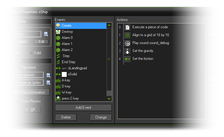 speed setting) a series of events are run, and you can choose to place code or DnD actions in your instances that respond to these events. Let's look at a typical object setup with events and actions: