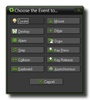 instances of that object should do when those events are triggered. To add events into the object, you press the Add Event button found at the bottom of the events list which will bring up the following