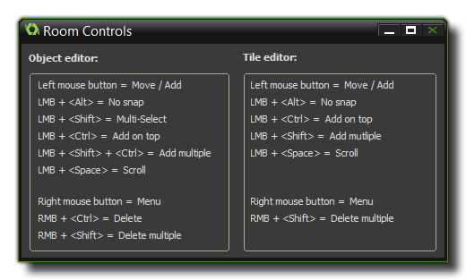 There are also a number of keyboard shortcuts that can be used to make your life easier when placing instances (you can open the following window that shows them all from the toolbar at the top of the room editor):