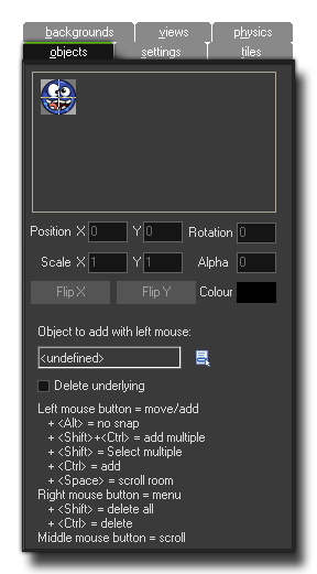 - Clicking with the left mouse button in the room will place an instance of the currently selected object, and clicking an instance will permit you to move it around the room.