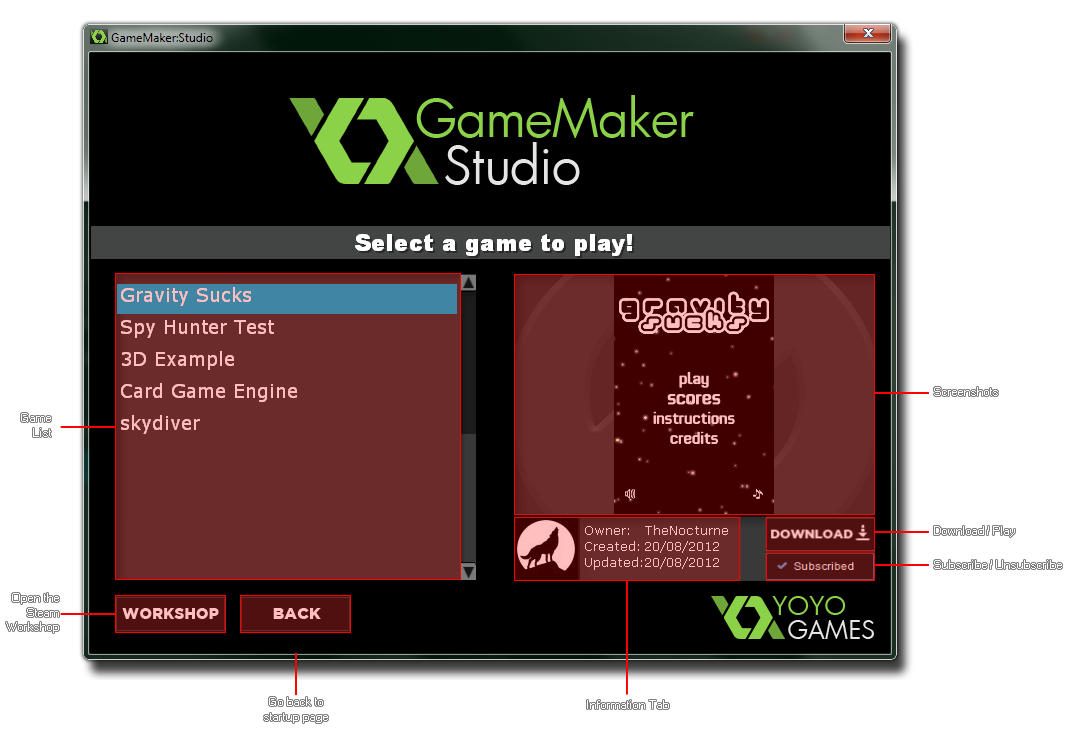 "Back" button will take you back to the main start-up screen where you can choose to start GameMaker: Studio, or restart the player again