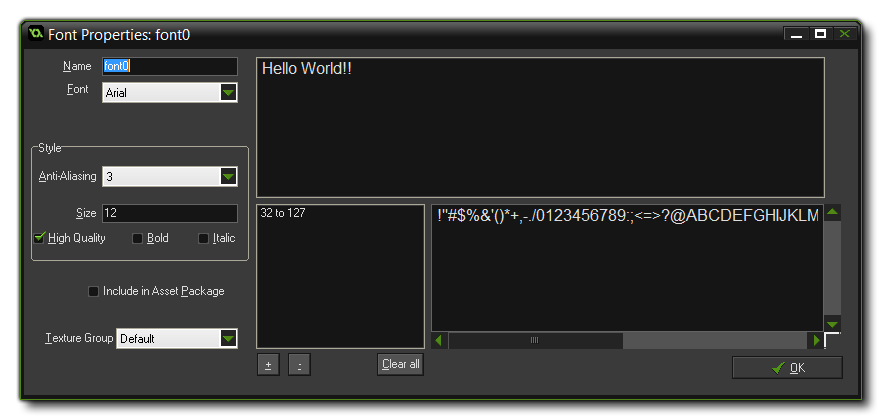 One final option that you have available to you is the ability to assign your font resource to a texture group. this can be very useful when it comes to optimising the way your game runs and the amount of texture swaps that must be done while the game is being played. for more information on texture groups please see the section Advanced Use - Texture Pages.
