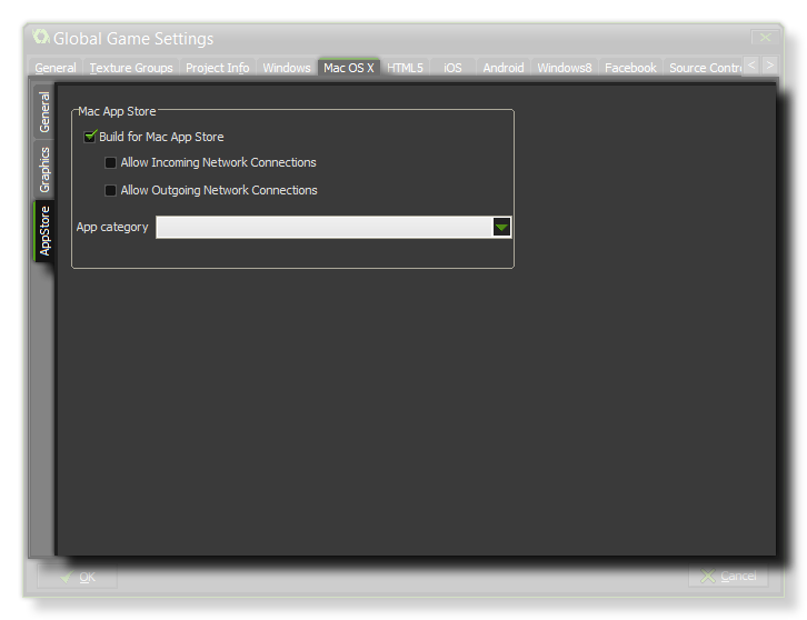 If you wish the finished game to be App Store Ready then you need to check the Build for Mac App Store option, but be aware that this will only function if you are a registered Developer