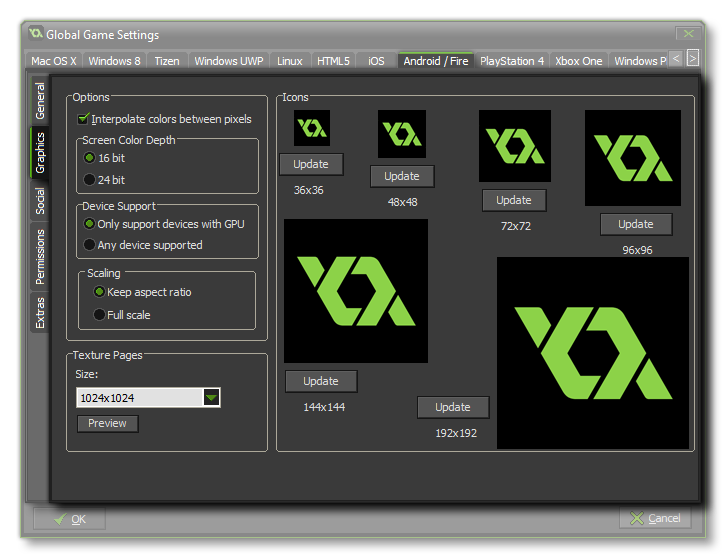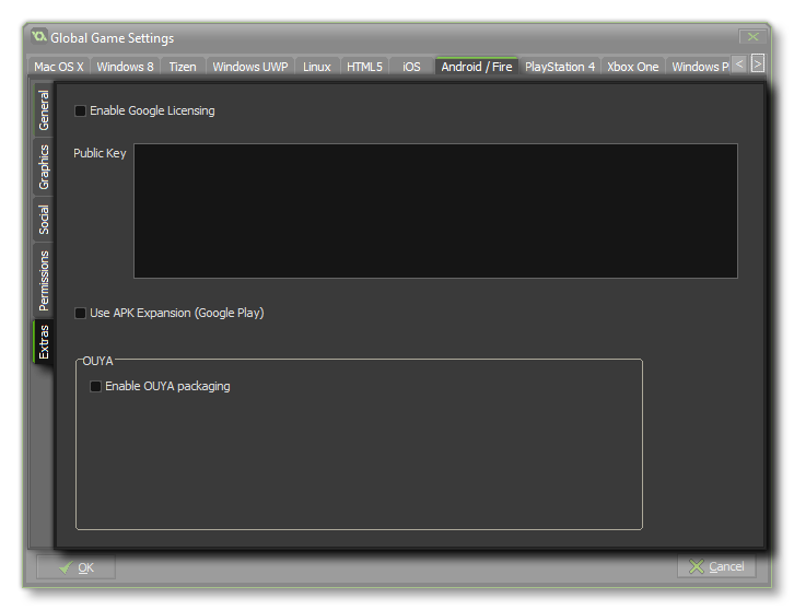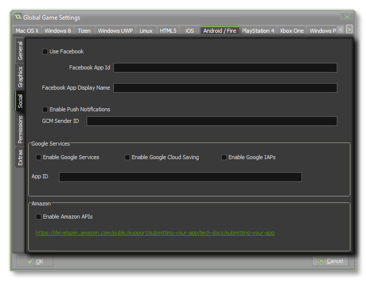NOTE: If you have any promotional trial version of Amazon Fire but don't have the Android module then you will have a separate Global Game Setting for Amazon Fire. See Amazon Fire Global Game Settings for more details.