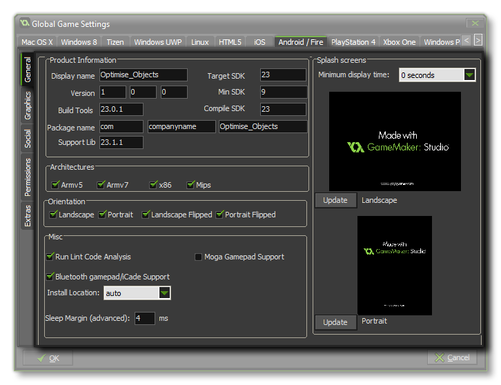 You can also set the Android Sleep Margin here. This option is related to reducing stuttering when running your game on specific systems. Basically, if your game is running faster than your room speed GameMaker Studio 2 will "sleep" for the remaining time, but this sleep can be quite inaccurate and you can often end of sleeping for longer than necessary, causing your frame to take longer which causes stuttering. To get around this we can sleep for less time, then sit in a tight loop for the remainder of the time to make it more accurate - although the problem with sitting in a loop is that it causes CPU usage to increase, which in turn can cause your CPU temperatures to rise and your fan to run faster. By default, this value is set to 4, and in 99.99% of the cases you'll be fine with this, but for low end machines or for machines with a lot of background processes running this may not be an ideal solution and a value of 5 up to 10 may be required. Note though that this is very much a device specific configuration and what works on your build device may not be appropriate for another user, and as such if in doubt leave it set to 4.