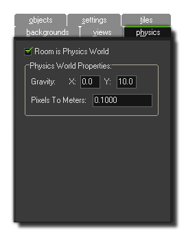 Before your room can use physics you must tick the option at the top of this tab labelled Room is Physics World. Once you have done that you can then continue on to set up the