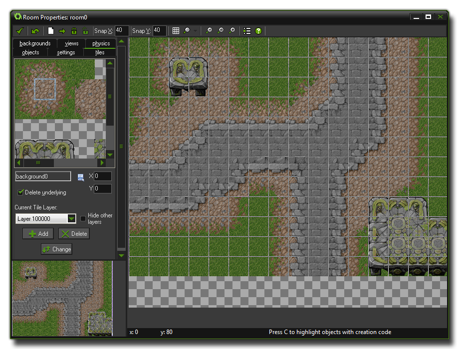 Tiles can be placed in layers at different depths, and if you look at the bottom of the tiles tab in the room editor you see the current depth you are placing them at. Default for this is 1000000 which is normally behind all instances (the higher the number, the further "behind", and the lower the number the further "in front"). You can use the Add button to add new tile layers, each with a different depth which you define, and in this way you can create different layers of tiles, and even objects if you also give the objects different depths so they are between the different tile layers. If you press Delete you can delete a tile layer together with all its tiles, but you must always have at least one layer, so even if you delete the last one, GameMaker: Studio will recreate a new, empty one for you again. If you press Change you can change the depth of a tile layer, which if you have given it the same depth as another layer, will merge the two sets of tiles together on the one layer.