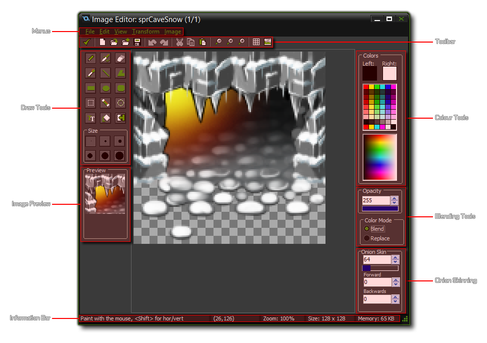 To aid you in your task of creating a good game, GameMaker: Studio provides you with its own editor for editing backgrounds and sprites. Both resources share the same editor so although this page refers to sprites,