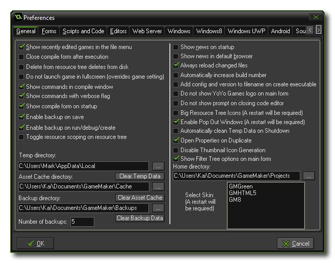 - Directories: You can set the different directories that GameMaker: Studio will use to save the asset cache, the temp files and any backups of your projects. Note that each of the given directories also has a "Clear..." button which will wipe all the accumulated data from the given folder.