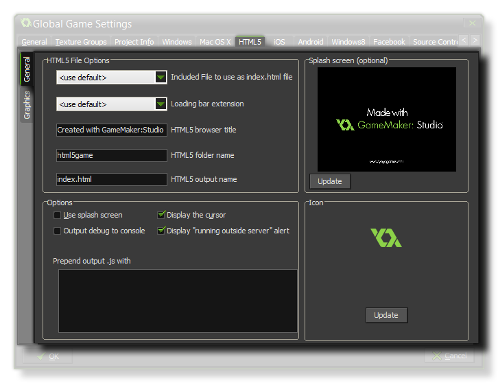 - adding a custom index.html to use instead of the pre-defined one that GameMaker: Studio generates by default. This can be very useful if you have a website design implemented or want to include certain features in all your HTML5 builds.