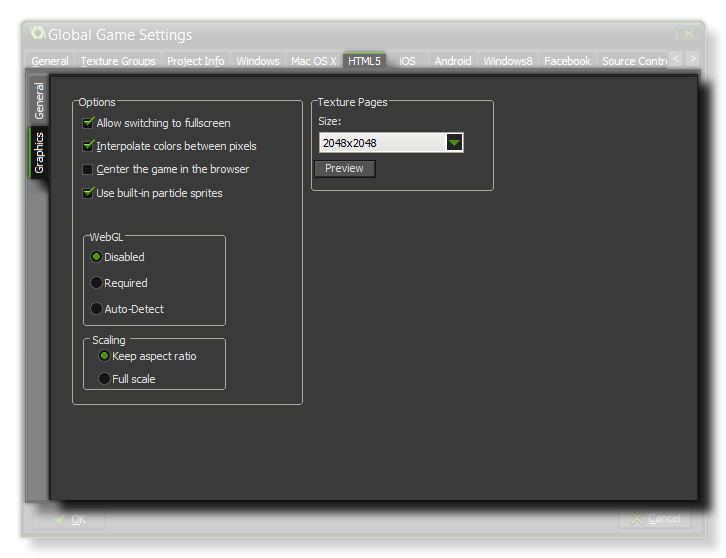 - WebGL - Choose whether to switch off WebGL support, make it optional (auto-detect), or make it a requirement for your game. It should be noted that to test performance under all circumstances, you should have this as disabled, then normally set it to auto-detect for publishing. Making it a requirement may reduce considerably the compatibility that your game has with different browser types.
