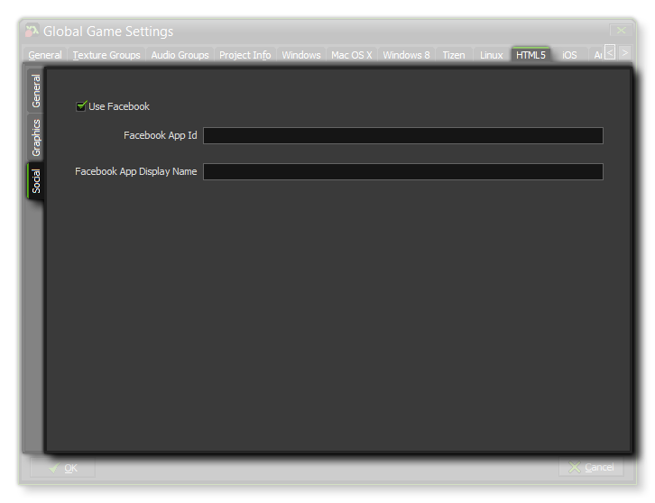 The social tab is used for setting up Facebook communication in your game. If you require the Facebook functions, you need to click the "Use Facebook" checkbox and then supply the Facebook