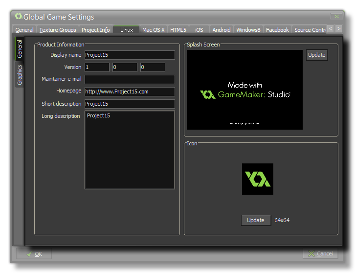 This tab is where you set the name of your game as it is to be displayed while running, add a splash screen, and set the game icon that will be used. The icon must be a 64x64 pixel image in the *.png