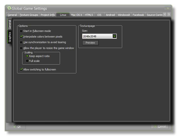 The graphics options will determine how your game is displayed when run and affect the way things like scaling and interpolation are handled. The following options exist: