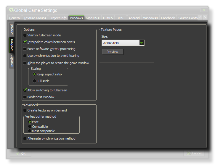 - Create Textures on Demand - Checking this will make the windows target work like all the other targets, ie: texture pages will be loaded into memory on demand and can be flushed again when required. This can cause a few milliseconds of pause in your game as the texture pages are loaded, and so should be optimised such that the textures required for a level are loaded at the start of the room to minimise impact.