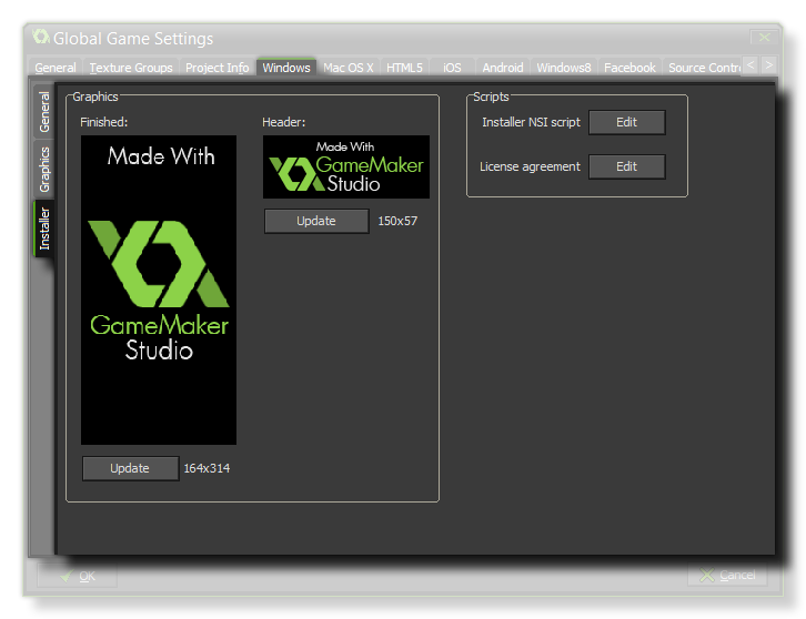 Windows games are created with an installer (previous versions of GameMaker just made an *.exe) and here you can define the various settings and graphics that GameMaker: Studio will use when