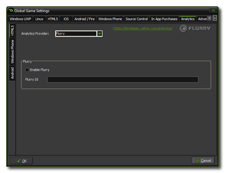 For all available platforms you can specify whether to use Flurry Analytics or Google Analytics to track your game, but due to the nature of these functions, you can only have one active at a time, so make sure that you check the correct one! Once you have flagged the Enable Flurry or Enable Google Analytics check-box for your analytics provider, you should also add the unique ID that you have been assigned into the appropriate area for HTML5, and for Android, you will be prompted to install the appropriate extension (and you add the ID value into the extension functions). You can find further information about this from the following Knowledge Base article: Analytics Provider Demos v1.4. Checking these boxes does not install the extension and you will need to download it independently from the YoYo Games Marketplace and import it into your game project.