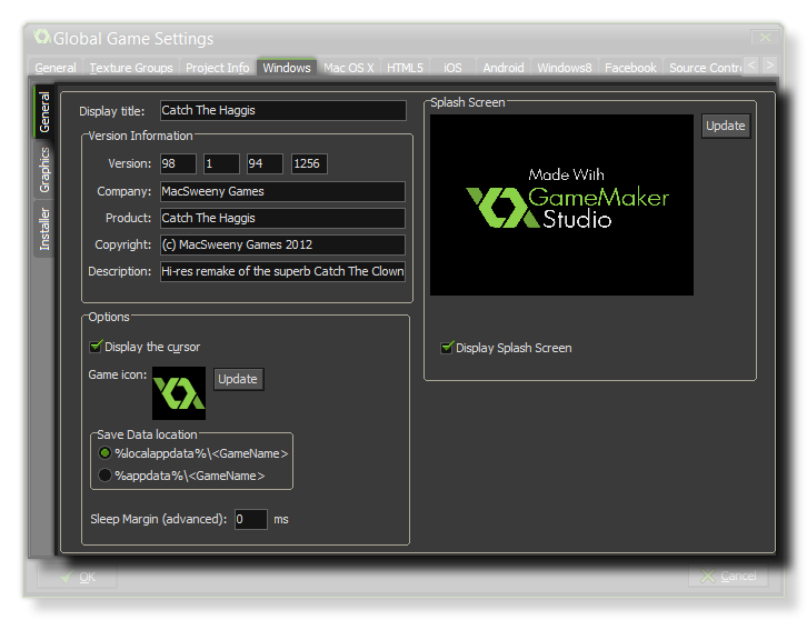 The final option is for setting the Windows Sleep Margin. This option is related to reducing stuttering when running your game on specific systems. Basically, if your game is running faster than your room speed GameMaker: Studio will "sleep" for the remaining time, but this sleep can be quite inaccurate and you can often end of sleeping for longer than necessary, causing your frame to take longer which causes stuttering. To get around this we can sleep for less time, then sit in a tight loop for the remainder of the time to make it more accurate - although the problem with sitting in a loop is that it causes CPU usage to increase, which in turn can cause your CPU temperatures to rise and your fan to run faster. By default, this value is set to 1, and in 99.99% of the cases you'll be fine with this, but for low end machines or for machines with a lot of background processes running this may not be an ideal solution and a value of 5 or 10 may be required. Note though that this is very much a system specific configuration and what works on your build machine may not be appropriate for another user, and as such if in doubt leave it set to 1.