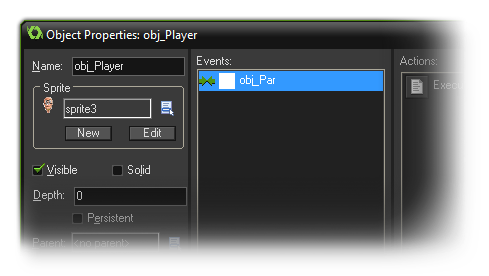 Another example would be if you have a game where you want to create 10 different objects and have them behave in the same way. Well you would create one parent object and in that have all your behaviour actions or code, and then you would create your ten objects with no actions or code, but different sprites, and assign them your parent object. Now, when you place these instances in a room they will all behave the same, but look different.