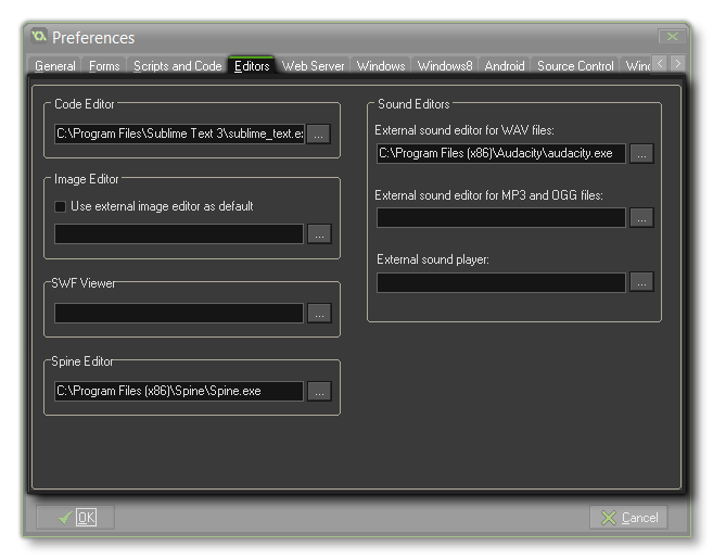 You can indicate the different external editors for the sound files you want to use asGameMaker: Studio does not contain internal sound editors yet. There are two possible editors, one each