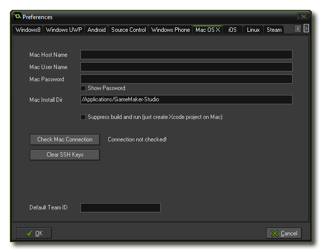 Finally you have the Default Team Id field. Here you can supply a default Apple Team Identifier which will then be used for all Mac OS builds. If you leave this blank or you wish to override this ID, you will need to supply one in the Mac OS Global Game Settings, otherwise your game will not build.