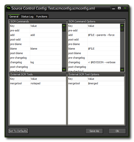 - General: The General tab deals with the Common SCM commands and External SCM Tools (which currently only covers the merge tool to use). Each command as a pre- and post- stage, and is split across the top two windows. The windows available in this tab are: