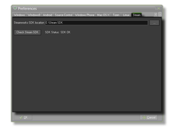 Once you have directed GameMaker: Studio to the Steamworks SDK, you should then click the Check Steam SDK button to ensure that GameMaker: Studio can communicate correctly