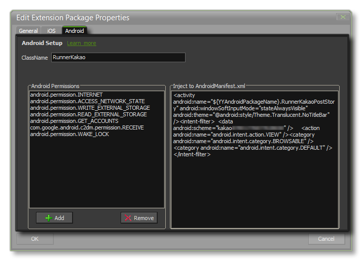 You can also set any extra code to be injected (added) to the Android Manifest XML file when your game is built for testing or final release. Make sure to revise this (and your permissions) carefully before