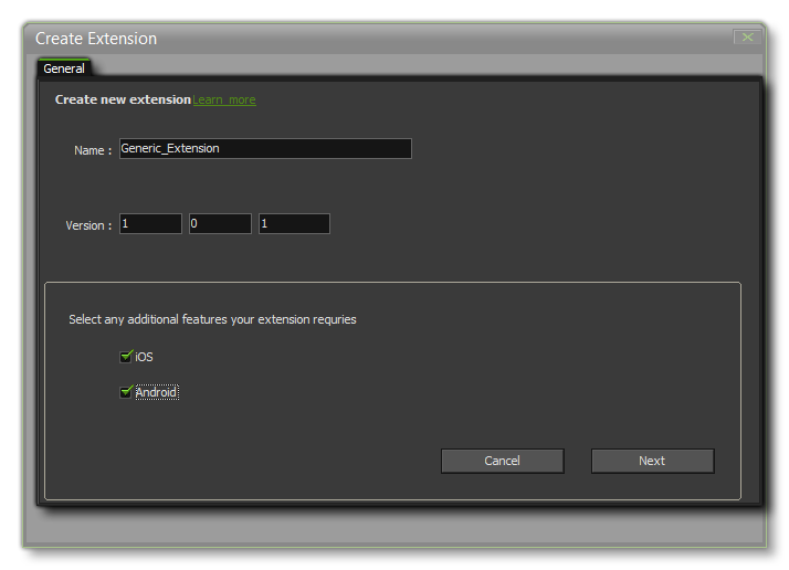 this information too. The Package ID should be unique to this extension and be in reverse URL format com.<company>.<extension_name>. If your extension package is for iOS or for Android, then you should mark the appropriate check boxes in this window too.