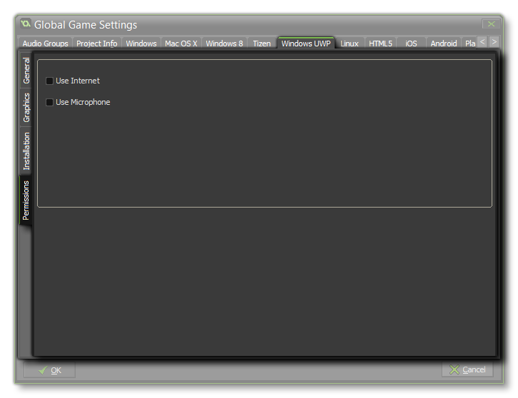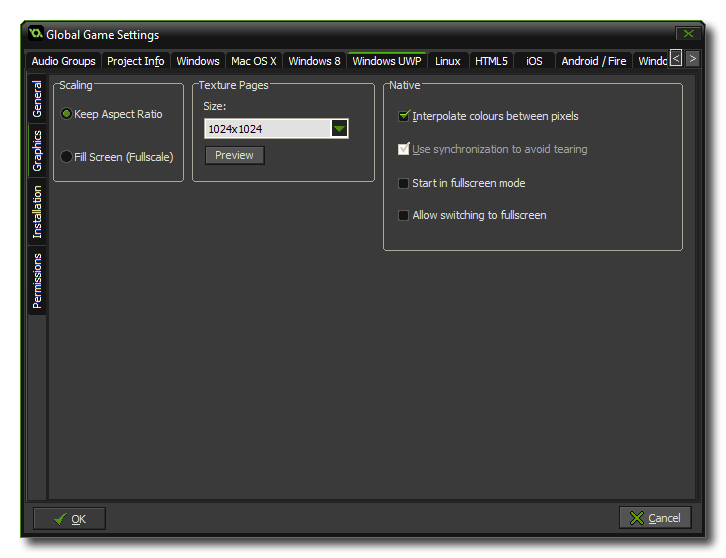 In the Global Games Settings of GameMaker: Studio, you can find the different setup options related to how your final game will look when you create the executable for the target platform. Here we will look at the Windows UWP tab. It is split into three sub-tabs, each of which is explained in the sections below:
