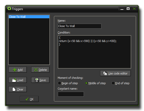 appear in the menu with available triggers and in the event lists for objects. The next you must do is specify the condition that will "trigger" the trigger event! This is done by writing a piece of GML