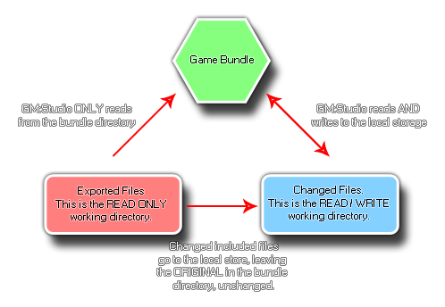 - Reading Operations - working_directory will first check the save area to see if the file being accessed is there, and if it is uses that. However if the file does not exists in the save area, it then checks the file bundle area and uses that (if the file being looked for is an included file with your game).