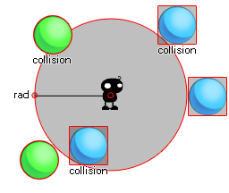 Here, the instance in the middle is using a collision circle to check for ball objects. Now, the blue ones do not have a precise bounding box and as you can see, even if the sprite is not actually touching