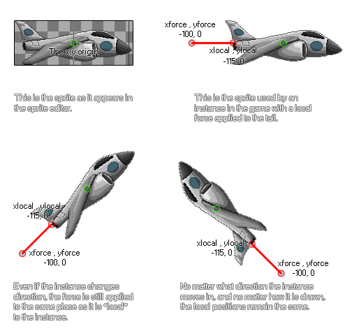 if it has no sprite) of the instance, without taking into consideration the direction or rotation it may have in the game room or physics world. It should be noted that with this function, forces are not applied
