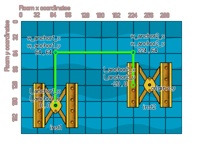 If you look at inst2 you can see that its local anchor point has been offset 20 pixels to the "left" of its origin (Remember! The world anchor points are defined using the room coordinates, while the local anchor