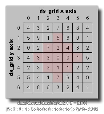 The above code will set the variable "val" to the mean value contained within the given disk of the ds_grid indexed in the variable "grid".
