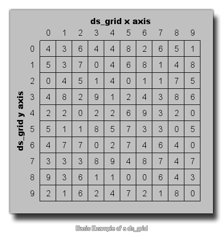 This type of structure allows you to set and retrieve the value of cells in the grid by giving the x and y index of it (which starts with 0 for both the x and the y axis and goes up to the width - 1 and the height -1).