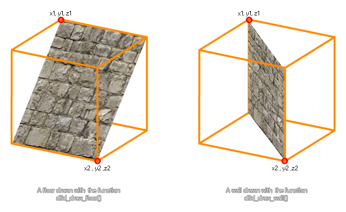 This function draws a simple floor in 3D space. You set the first corner coordinates (x1,y1,z1) and then the coordinates for the opposite lower corner. You can also specify a texture for the floor and