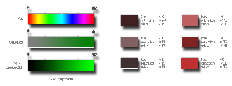 GameMaker: Studio provides this function (as well as others) to permit the user to make their own colours. This particular function takes three component parts, the hue, the saturation and the value (also know as "luminosity") to create the colour desired. These values are taken as being between 0 and 255 so you can make 16,777,216 (256*256*256) colours with this! Below you can see an image of how these components look when separated: The image on the left is a break-down of the individual components of the function, and then on the right is an illustration of how changing these components affects the end colour. As you can see, even without changing the hue (it stays at 0, red), we can dramatically change the colour with the other two settings, with saturation making the colour tone go from grey (0) to a pure tone (255), and with the value making it go from darker (0) to lighter (255).
