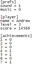 You can use this function to read a string (text) from an ini data file. Ini files are split into sections and then each section is subsequently split into key - value pairs. So a typical ini file would look something like this: