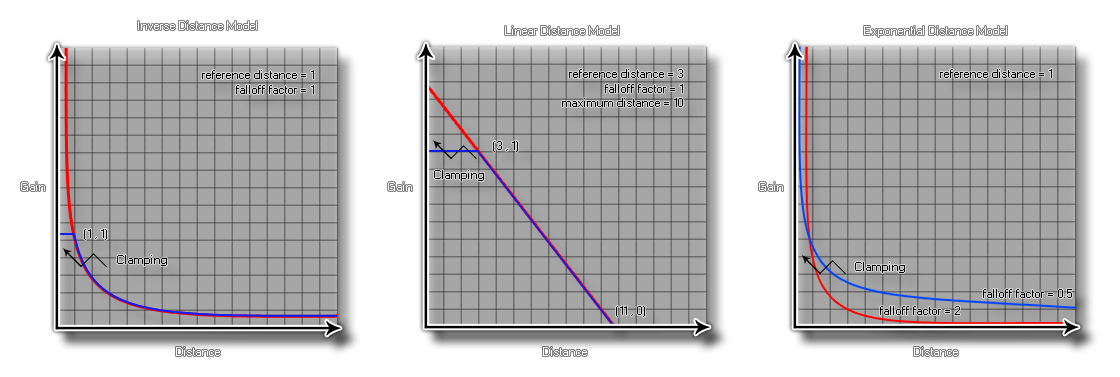 When setting falloff in your game with the appropriate functions there are three arguments that you will need to set, and each one is appropriate to a specific, model and will affect the way the final sound is "heard"