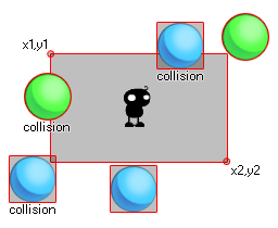 Here, the instance in the middle is using a collision rectangle to check for ball objects. Now, the blue ones do not have a precise bounding box and as you can see, even if the sprite is not actually touching