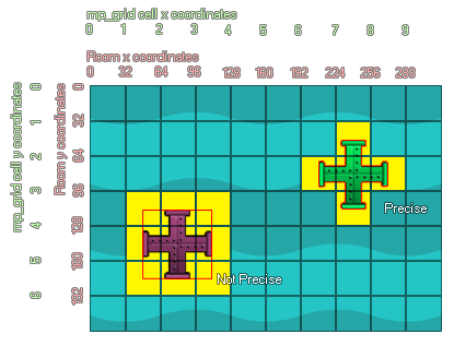 The two instances above have been added into the mp_grid using the mp_grid_add_instances function with precise being set as true. As you can see the, green instance has only marked the grid squares it "touches" as forbidden, due to the fact that its sprite mask is also set to precise. However the second instance has marked other cells too which don't appear to be touching. This is because the sprite mask is not set to precise, meaning that even if you are using the precise setting in the function, only the bounding box of the sprite will be considered. This is also what would happen if you set the precise argument of the function to false - even instances with a precise sprite mask will be added into the grid based on their bounding boxes.