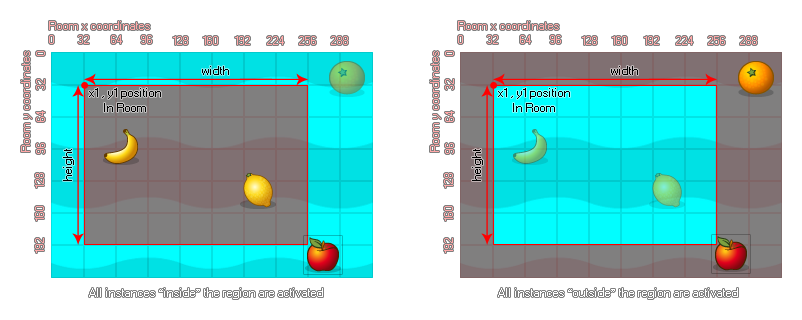 With this function you can define a region within the room to activate instances that have previously been deactivated. This region can either be flagged as "inside" or "outside" as demonstrated in the following image: