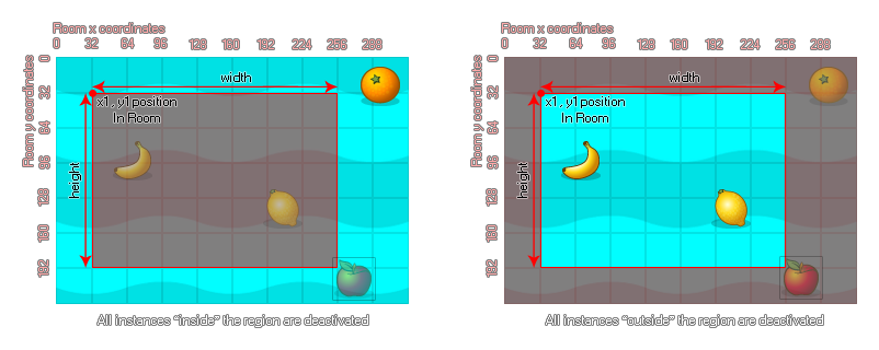With this function you can define a region within the room to deactivate instances that have previously been activated. This region can either be flagged as "inside" or "outside" as demonstrated in the following image: